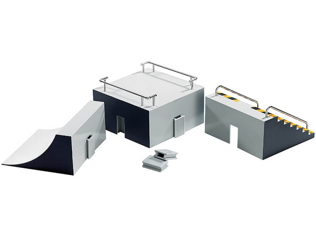 Artikelmerkmale:- 9-teiliges Skatepark-Set mit Quarterpipe (14 x 7,5 x 14,5 cm), Funbox mit Treppe (14,5 x 14,5 x 9 cm),